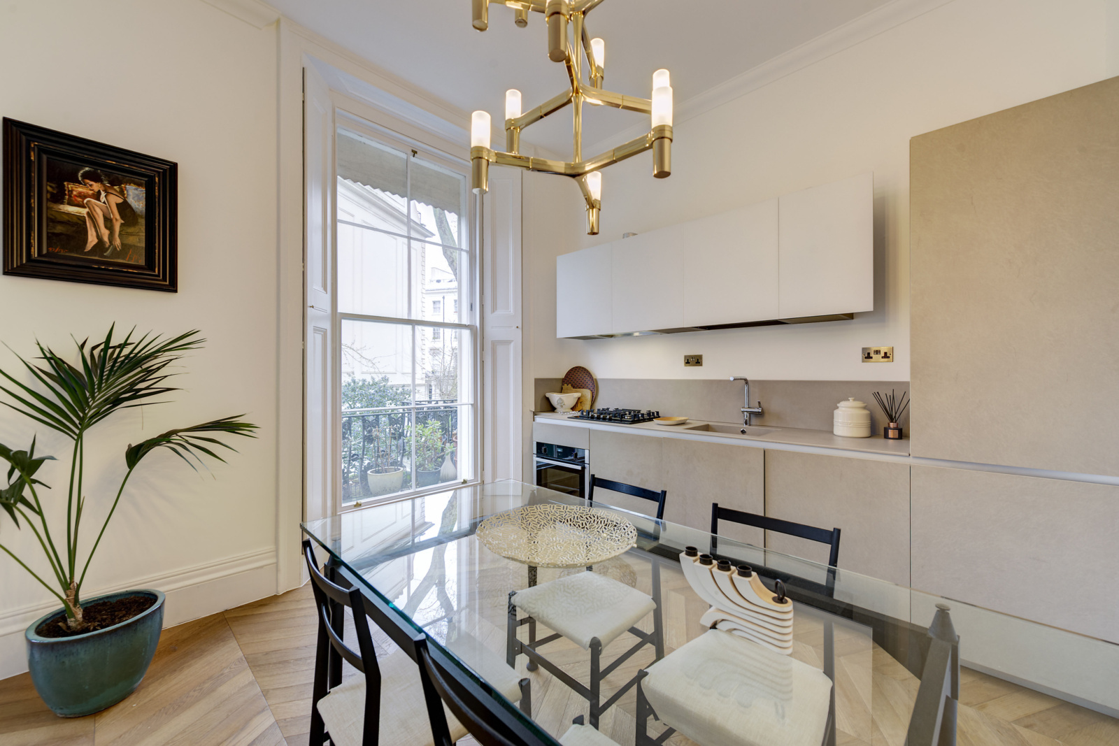 Beautifully finished throughout, key features include a Boffi kitchen with Gaggenau appliances, Italian bespoke joinery and furnishings, natural marble bathrooms, parquet flooring, bespoke plaster mouldings and cornice and an antique regency fireplace.