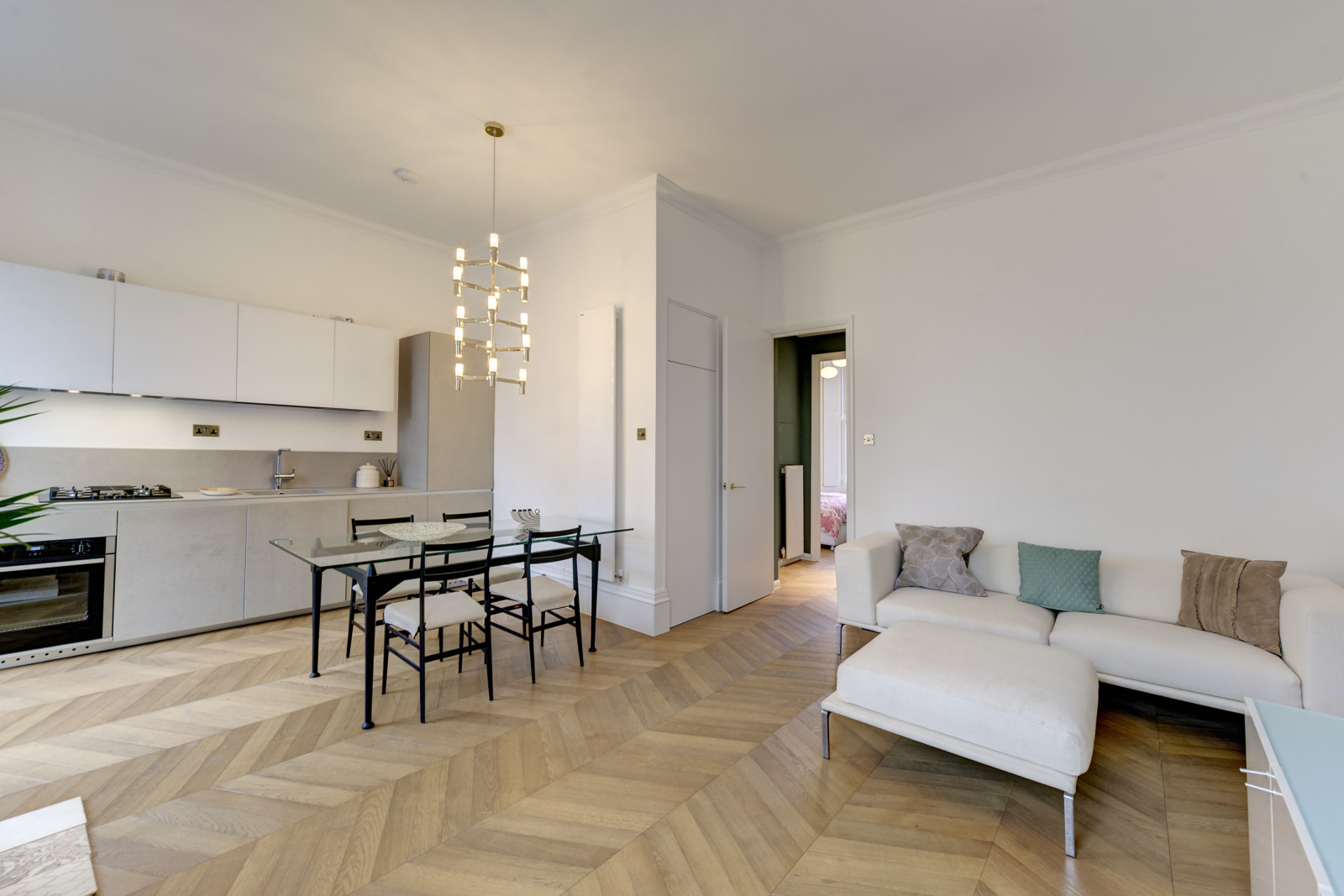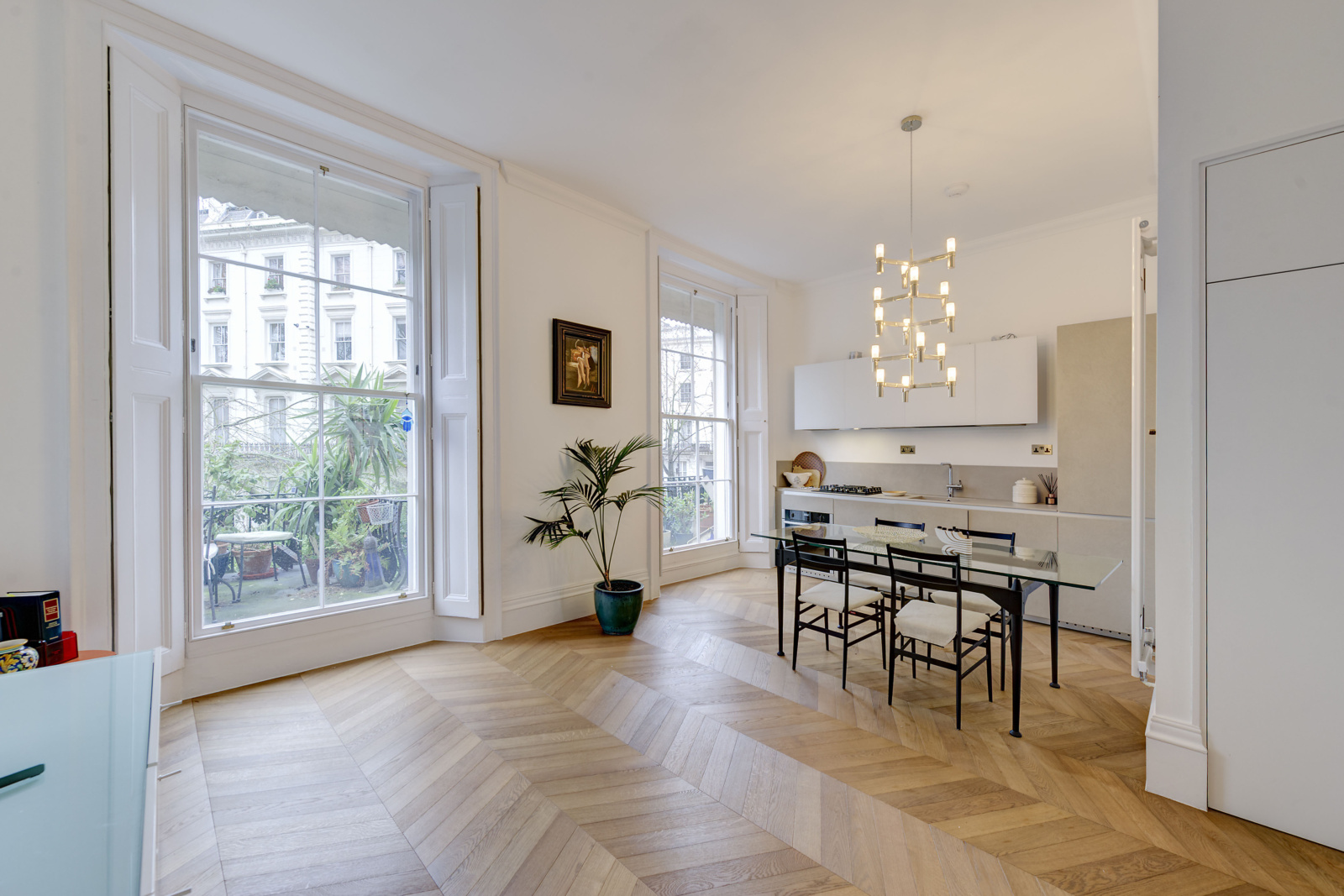 A wonderful first floor flat with high ceilings. The property has been renovated to a very high standard with superb finishes. The open plan reception room has a full length balcony which overlooks Porchester Square.